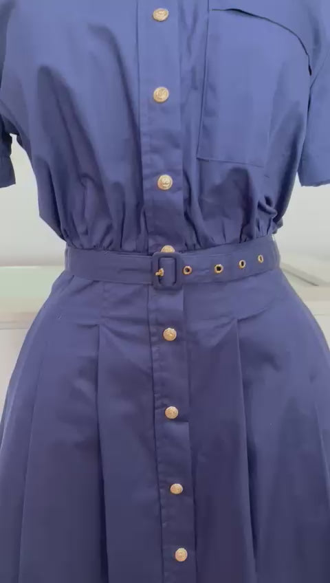 Vestido camisero en tono azul marino con botones frontales y cinturón ajustable que define la cintura. Un diseño clásico, cómodo y sofisticado para cualquier ocasión.