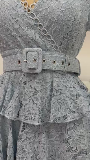 Vestido midi de encaje en tono celeste con escote en V, mangas con olanes y falda en capas. Su cinturón define la cintura y crea un look romántico, femenino y muy favorecedor.