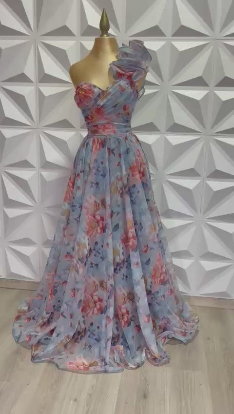 Este vestido largo es una verdadera pieza de ensueño. Su tela vaporosa con estampado floral en tonos azules, rosados y melocotón crea un movimiento hermoso y una caída etérea que roba miradas. El diseño de un solo hombro, acompañado de un detalle voluminoso plisado, aporta un toque único, moderno y súper elegante.