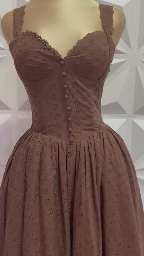 Este vestido midi en tono café es una pieza espectacular para quienes aman un estilo romántico y delicado. Confeccionado en encaje perforado, ofrece textura, suavidad y un acabado ultra femenino. Su parte superior tiene un diseño estilo corset con botones decorativos al frente y tirantes anchos con detalle de encaje que realzan el busto y la figura.
