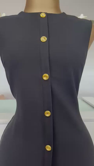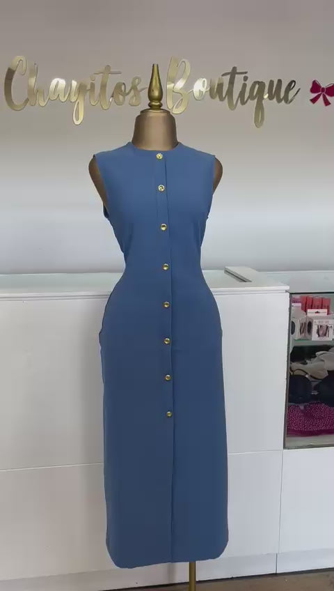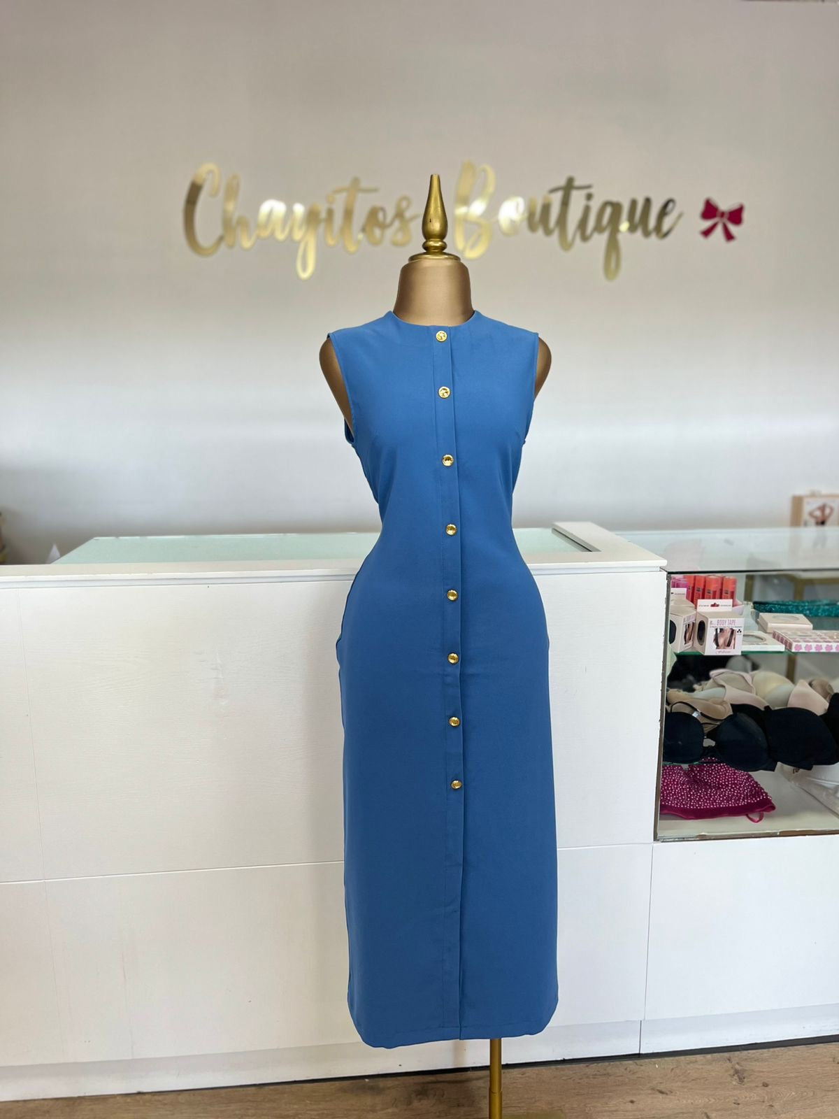 Vestido Azul Midi con Botones Dorados – Estilo Elegante y Minimalista