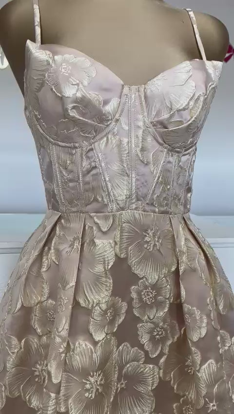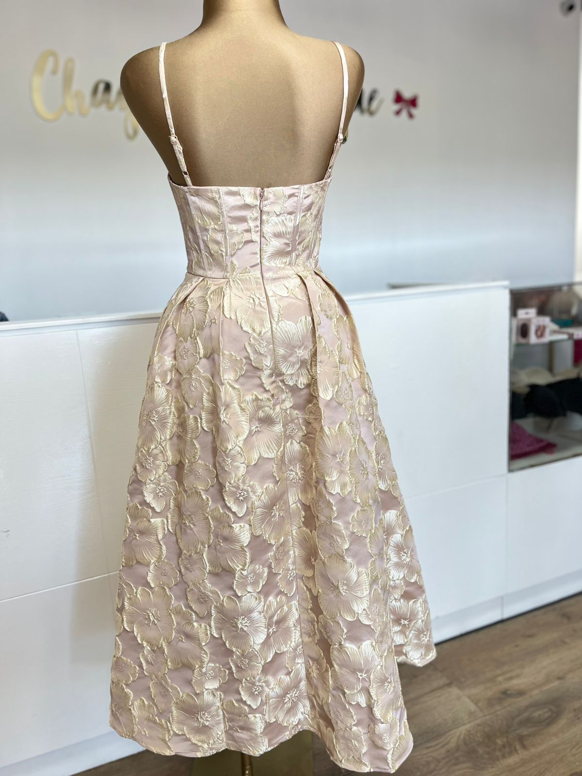 Este vestido midi en tono champagne rosado destaca por su diseño sofisticado y femenino, confeccionado en una tela bordada con relieve floral dorado que aporta un acabado lujoso y de alta calidad. Su cuerpo tipo corset estructurado define la cintura y realza la silueta de manera elegante, mientras que los tirantes delgados ajustables brindan comodidad y un ajuste perfecto.