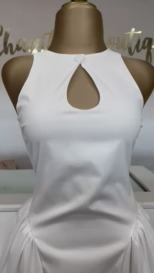 Este vestido midi en tono blanco combina elegancia, frescura y un diseño moderno que favorece cualquier silueta. Su corte limpio destaca un escote redondo con abertura tipo lágrima, sujeto con un delicado botón que aporta un toque femenino y refinado.