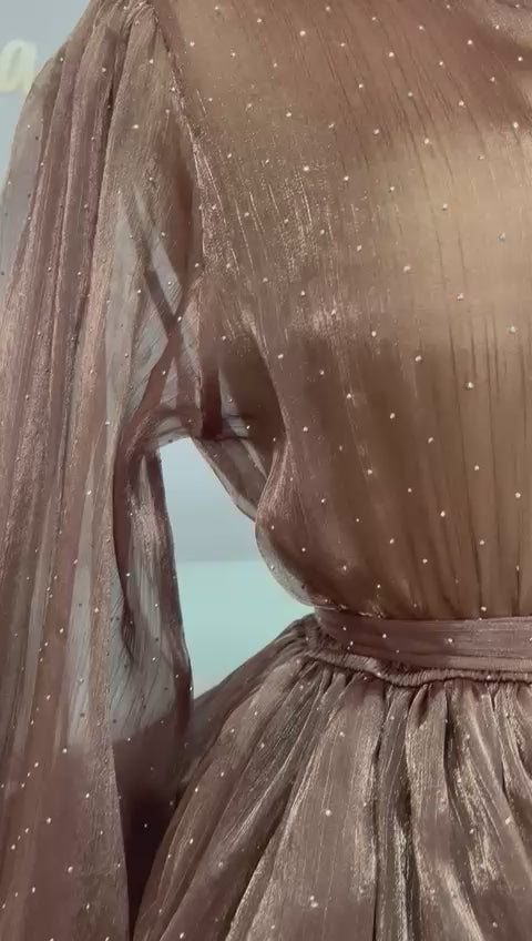 Este vestido corto en tono café chocolate es una pieza sofisticada y femenina, ideal para destacar con elegancia en cualquier ocasión especial. Confeccionado en tela ligera con acabado translúcido y brillo sutil, aporta un efecto delicado y refinado que eleva el diseño.