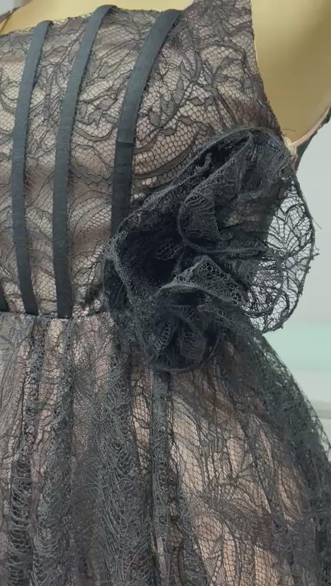 Este vestido midi de encaje negro es una pieza sofisticada y atemporal que destaca por su elegancia y feminidad. Su delicado encaje floral con transparencias sutiles se combina con un forro en tono nude, creando un contraste refinado que realza la silueta de manera elegante.
