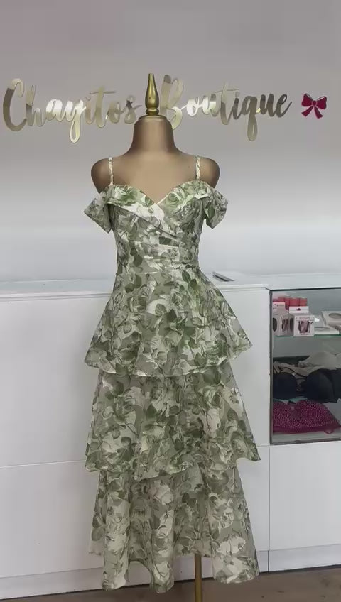 Vestido midi con delicado estampado floral en tonos azul y gris, diseñado para resaltar la silueta con un toque romántico y femenino. Cuenta con escote en corazón, tirantes delgados y olanes en cascada que aportan movimiento y elegancia. Ideal para eventos de día, reuniones especiales o celebraciones formales.
