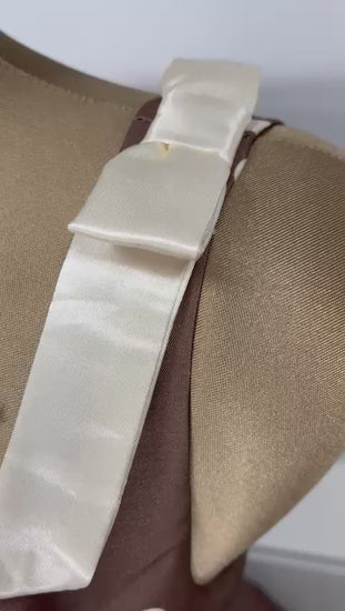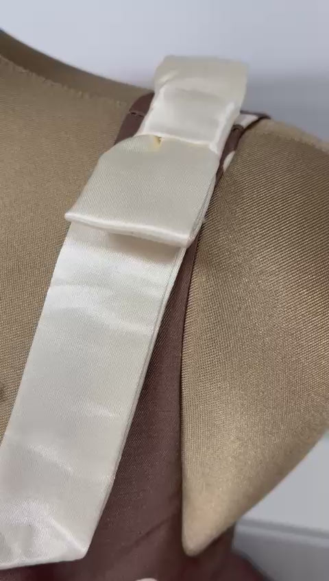 Este vestido corto en tono café chocolate con lunares blancos es una pieza encantadora de inspiración clásica, ideal para un look femenino y sofisticado. Confeccionado en tela satinada de acabado suave, ofrece una excelente estructura y una caída elegante que realza la silueta.