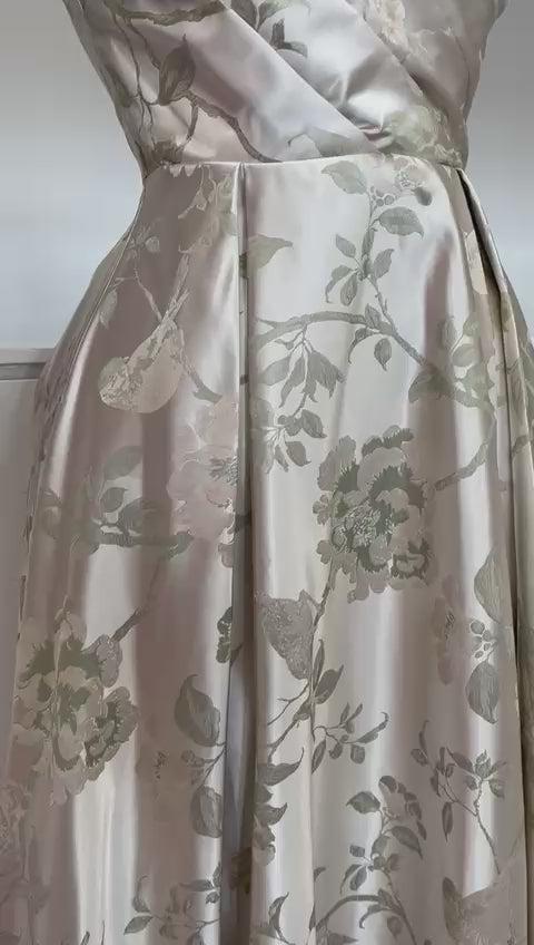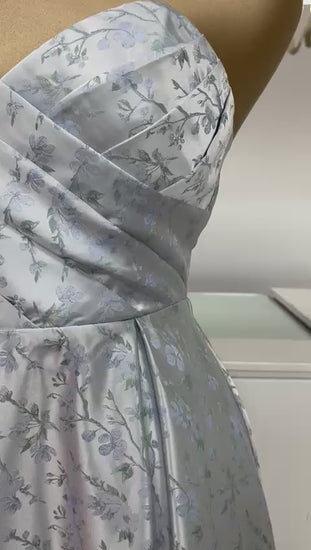 Vestido strapless con escote corazón y delicado estampado floral en tonos ivory. Su falda amplia y corte a la cintura crean una silueta femenina, romántica y elegante, ideal para eventos de día o celebraciones especiales.