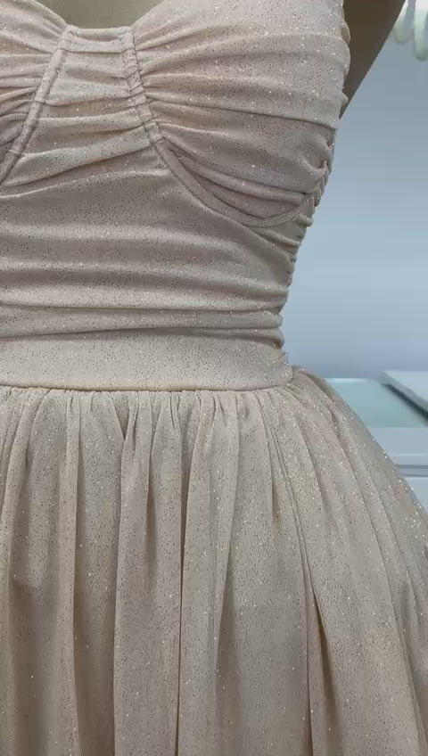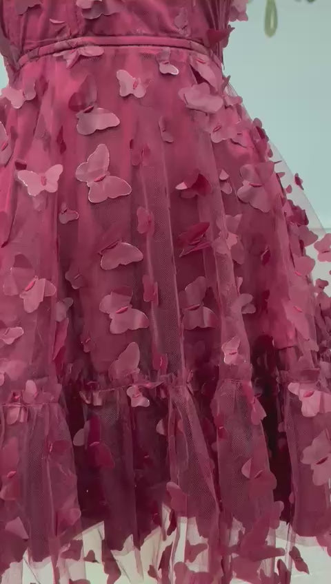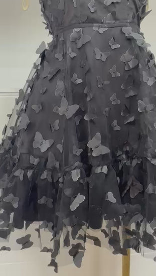 Este vestido profundo está diseñado para enamorar a primera vista. Su silueta femenina con tirantes delgados y escote estilo corazón realza la figura de forma delicada, mientras que la falda de tul con apliques 3D en forma de mariposas crea un efecto romántico, dinámico y súper elegante.